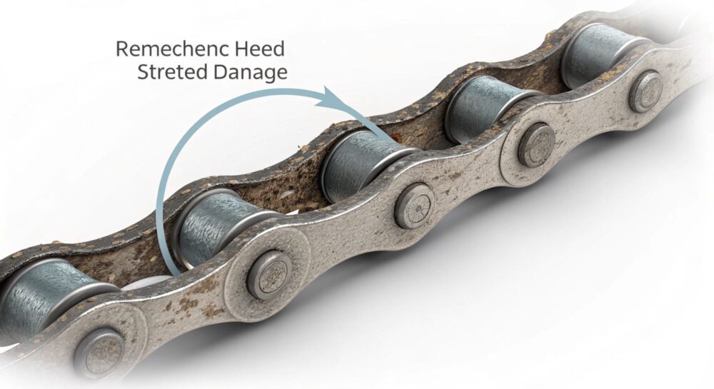 Растяжение цепи — это постепенное увеличение ее общей длины, которое происходит из-за износа в местах соединения звеньев. Каждый пин (ось) цепи и отверстие в ролике (если цепь роликовая) со временем истираются. Этот процесс ускоряется под воздействием нагрузок, трения, загрязнений и недостаточной смазки.
