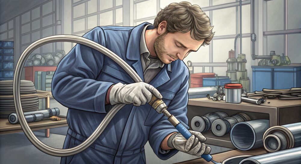 Процесс опрессовки начинается с подготовки внутренней резиновой трубки, которая затем армируется металлической оплеткой. После этого рукав подвергается вулканизации под высоким давлением и температурой, что придает ему окончательную форму и свойства. Завершающим этапом является тестирование готового изделия на прочность и герметичность.